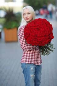 Букет из оранжевых кустовых роз, фиолетовой эустомы, гиперикума, альстромерии, зелени в натуральной упаковке с лентами.